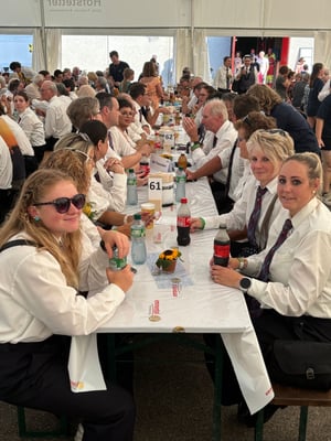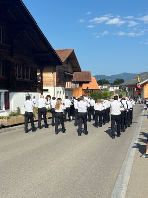 Unser erster offizieller Einsatz an diesem Tag war um 16.30 Uhr die Marschmusik. Bei Temperaturen über 30 Grad marschierten wir von der Kirche Amsoldingen Richtung Festgelände, welches sich bei der Mehrzweckhalle Amsoldingen befand. Ausnahmsweise marschierten wir nicht wie normal in Vollmontur, sondern nur im Hemd und ohne Hut. Bis zu unserem nächsten Einsatz hatten wir genügend Zeit unsere Verpflegungsgutsscheine einzulösen. Um 21.00 Uhr ging es dann auf der Bühne im Festzelt weiter. Unser Vortrag kam bei den Besuchern ganz gut an und auch unser Dirigent fand positive Worte für unseren Auftritt.